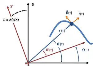 Figure 3: Inertial frame of reference S and instantaneous non-inertial co-rotating frame of reference S' . The co-rotating frame rotates at angular rate Ω equal to the rate of rotation of the particle about the origin of S' at the particular moment t. Particle is located at vector position r(t) and unit vectors are shown in the radial direction to the particle from the origin, and also in the direction of increasing angle θ normal to the radial direction. These unit vectors need not be related to the tangent and normal to the path. Also, the radial distance r need not be related to the radius of curvature of the path.
