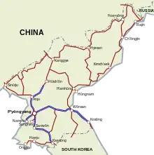 This article incorporates text from this source, which is in the public domain. Savada, Andreas Matles, ed. (1994). "North Korea: A Country Study". Country Studies. Federal Research Division. Retrieved 27 July 2013.{{cite encyclopedia}}: CS1 maint: multiple names: authors list (link) CS1 maint: numeric names: authors list (link) Fourth ed. Washington: Federal Research Division of the Library of Congress. ISBN 0-8444-0794-1. - ↑ "North Korea: Transportation". CIA World Factbook. Retrieved July 13, 2013.