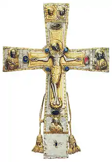 The Cross of the Field, also known as the Cross of the Oriflamme, is a Greek cross with arms slightly expanded at the ends, with an extension on the lower arm making it a Latin cross. It is 42 centimeters high, 28.5 centimeters wide and 5 centimeters thick, consisting of a walnut wood core entirely covered with pure silver foil with gilded silver edges attached by pegs.[8] On one side the arms are connected by a disk, on the other by short diagonal strokes. The whole is adorned with set gems and figures worked in high relief in the silver foil.