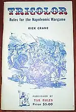 Tricolor is a rulebook for wargaming with Napoleonic miniatures. It was written by Rick Crane and published by TSR, Inc. in 1974 with interior artwork by Greg Bell. The rules require a six-sided die. 50 pages.