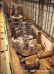In 2006 a Tripod onshore demonstrator was designed by OWT for Multibrid GmbH, manufactured and erected in Bremerhaven, Germany, by WeserWind GmbH Offshore Construction Georgsmarienhütte. This was the beginning of a long lasting collaboration between the turbine developer and manufacturer Multibrid, the foundation designer OWT and the fabricator WeserWind. Meanwhile, the design covers the demands of an offshore turbine foundation to sufficient extent, the fabrication was even challenging regarding size and shape of the structure. That time WeserWind was supported in terms of fabrication and assembly by its sister company IAG Industrieanlagenbau Georgsmarienhütte GmbH, a member of the Georgsmarienhütte group as well. The first operation of the turbine was accompanied by the research project IMO-Wind.[2] The first steps in condition monitoring have been undertaken including the determination of stress curves, the so-called "Hot spot" Survey, in order to enable the comparison with calculation models.