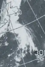 A hybrid-type depression formed east of Bermuda on July 29. It moved rapidly southwestward before turning to a northwest drift. On August 3, it was classified as a tropical depression, and the next day the system passed near Bermuda. The depression accelerated to the northeast, strengthening into a tropical storm on August 5. It intensified further due to baroclinity, or enhanced instability through different levels of the atmosphere caused by temperature and moisture gradients.[8] On August 6, a drilling rig about 230 mi (370 km) southeast of Newfoundland recorded sustained winds of 90 mph (140 km/h) with gusts to 126 mph (204 km/h) at an altitude of 325 ft (99 m); this suggested the storm attained hurricane status at 46° North, which is the northernmost location for a tropical storm to intensify into a hurricane.[6][4]