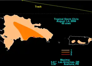 - ↑ Espancinsular (2006). ""Chris" se alejó de República Dominicana pero dejó agua, inundaciones y daños menores" (in Spanish). Retrieved 2006-08-28.