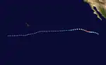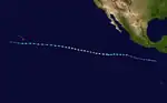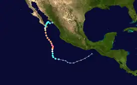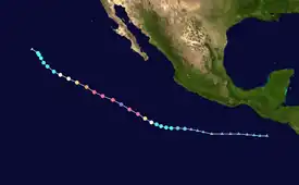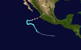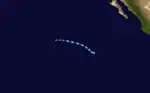Forecasts at the outset of the 2023 season predicted busier-than-normal tropical cyclone activity in the eastern Pacific basin, largely due to El Niño.[6] However, no tropical cyclones formed in the first six weeks of the season. When the first system, Hurricane Adrian, developed on June 27, it became the second-latest forming first named storm in the eastern Pacific in the satellite era (since 1971), only behind Tropical Storm Agatha in 2016.[7] In July, Hurricane Calvin became the season's first major hurricane, later passing just south of the Big Island of Hawaii as a tropical storm, bringing widespread rainfall to the area and neighboring Maui. In August, Category 4 Hurricane Dora passed south of the Hawaiian Islands and contributed to strong gradient winds over Hawaii, which in turn helped fan the flames of multiple devastating wildfires. [3] Later that month, Hurricane Hilary made landfall as a tropical storm in Baja California, later bringing torrential rainfall and gusty winds to the Southwestern United States. In early September, Hurricane Jova, the first Category 5 hurricane in the basin since 2018, caused rainfall, high waves and rip currents in areas previously affected by Hilary.