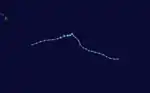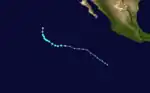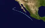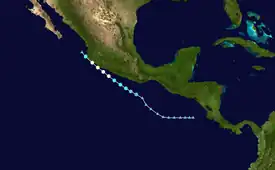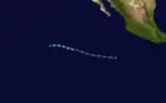 On August 1, a tropical wave emerged offshore Guatemala.[75] A low-pressure area developed a couple days later, as it passed southwest of Mexico.[76] After further organization, the disturbance developed into a tropical depression around 12:00 UTC on August 5. Moving northwestward toward the southern tip of the Baja California peninsula under favorable conditions, the system began to rapidly intensify, becoming Tropical Storm Eugene six hours later, and attaining peak sustained winds of 70 mph (110 km/h) at 12:00 UTC on August 6.[75] What appeared on satellite imagery to be a possible eye feature was observed at the center of the storm, but soon deteriorated.[77] Later, Eugene moved over cold water west of the Baja California peninsula where its diminishing thunderstorm activity ceased, and it transitioned into a post-tropical cyclone on the afternoon of August 7.[78] The system never directly affect any land areas,[75] though its remnants carried isolated rain showers to the San Francisco Bay Area a few days later.[79]