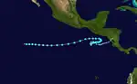 An area of low pressure formed near the southwest coast of Costa Rica on June 25.[39] Slow to organize, the disturbance ultimately able to do so, becoming Tropical Depression TwoE at 09:00 UTC on June 29.[40] Later, at 21:00 UTC, the depression became Tropical Storm Beatriz while located about 105 mi (170 km) south-southwest of Punta Maldonado, Guerrero.[41] Paralleling the coast, Beatriz was upgraded to a hurricane at 15:00 UTC the next day and soon attained peak winds of 85 mph (140 km/h). An eye began to appear on satellite around this time.[42] However, since Beatriz's circulation was severely disrupted by land interaction, the system weakened to a tropical storm early on July 1,[43] and Beatriz dissipated later that day just offshore from Cabo Corrientes, Jalisco.[44]