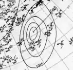 Around August 31, a low-pressure area formed along the tail end of a cold front extending from the Bahamas to Bermuda.[4] Early on the following day, a tropical depression developed roughly 510 mi (820 km) east-southeast of Jacksonville, Florida.[2] The depression moved slowly east-northeastward as the cold front dissipated.[4][2] Late on September 3, the system intensified into a tropical storm, and the next day the cyclone passed northwest of Bermuda.[2] Based on observations from the S.S. Evergreen City, the small storm likely reached Category 1 hurricane intensity early on September 5.[4] The cyclone continued to strengthen, reaching Category 2 intensity on September 6 while drifting northward and then peaking with maximum sustained winds of 105 mph (165 km/h) early the following day. On September 8, the system curved northwestward and weakened to a Category 1 hurricane. The storm then turned north-northeastward on September 9 and transitioned into an extratropical cyclone later that day. The extratropical low continued north-northeastward until dissipating over southern Newfoundland on September 10.[2] Cape Race observed sustained winds of 29 mph (47 km/h).[4]