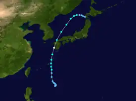 Following two previous tropical cyclones to the northwest, Percy tracked generally north-northwest[7] while slowly strengthening.[8] On the evening of July 28, the JMA declared Percy a severe tropical storm.[2] The development of a cloud-filled eye and satellite intensity estimates of T4.0/120 km/h (75 mph) prompted the JTWC to upgrade Percy into a typhoon midday on July 29, with winds of 120 km/h (75 mph), its peak intensity.[1] Meanwhile, the JMA estimated that Percy attained its peak wind speed of 115 km/h (70 mph) and a minimum barometric pressure of 975 mbar (28.79 inHg).[2] Accelerating towards Japan,[1] Percy began to weaken.[6] That evening, the storm made landfall over Kyushu before emerging into the Sea of Japan.[7] On July 30, the JMA downgraded Percy to a tropical depression,[2] and several hours later, the JTWC issued its final advisory on the system, as it had dissipated over the Sea of Japan.[1] The JMA ceased tracking the system altogether on August 1.[2]