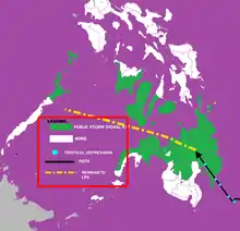 Late on November 10, as the system moved into the Philippine area of responsibility, PAGASA issued the Public Storm Warning Signal Number 1 for seven areas in Mindanao, indicating the potential for winds between 30–60 km/h (20–35 mph).[6] Over the next day these warnings were extended to cover three provinces in Luzon, eight provinces in Visayas and twenty-one provinces in Mindanao.[11] On Cebu Island, officials ordered schools to close during the storm's passage.[20] After the extreme damage due to Typhoon Haiyan in the Philippines, the depression that became Podul affected the same areas just days later, which affected rescue work.[21] The depression caused additional difficulties in travel and communications.[22] In addition to causing a landslide in Monkayo,[23] flooding from the depression covered roads and forced about 1,000 families to evacuate.[24] In Davao del Norte, the depression resulted in river flooding that killed two people.[25]