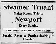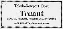 On the Fourth of July, 1910, Truant was scheduled to make extra excursion runs from Toledo to Newport, to leave Toledo at 7 a.m., 12:30 p.m., and 7:30 p.m., and departing Newport for Toledo at 10 a.m., 6 p.m., and immediately after the dance at night.[18] The round trip fare was 75 cents, 25 cents more than the usual Sunday excursion fare to Newport on Truant.[18]