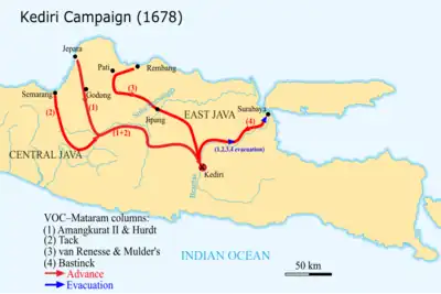 VOC and Mataram forces marched inland against Kediri in September 1678. Following a proposal by the king, the troops were split to take three parallel, less direct routes, in order to cover more locations and "overawe" factions who were wavering on which side to take.[36] The king's idea worked, and as the campaign proceeded, local bands joined the troops, eager for booty.[20] Kediri was taken on 25 November by an assault force led by Captain François Tack.[20][32] The victorious troops proceeded to Surabaya, the largest city in East Java, where Amangkurat established his court.[37] Elsewhere, the rebels were also defeated. In September 1679, combined VOC, Javanese, and Bugis forces under Sindu Reja and Jan Albert Sloot defeated Raden Kajoran in a battle in Mlambang, near Pajang.[7][38] Kajoran surrendered but was executed under Sloot's orders.[38] In November, the VOC and allied Bugis forces under Arung Palakka expelled the Makassarese rebels' stronghold in Keper, East Java.[7] In April 1680, after what the VOC considered the fiercest battle of the war, the rebellious lord of Giri was defeated and most of his family was executed.[7] As the VOC and Amangkurat won more victories, more and more Javanese declared their allegiance to the king.[7]