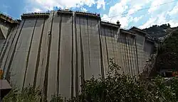 The Tsankov Kamak dam is the first double curvature arch dam[2] in cupola shape in Bulgaria.[3] It has a maximum dam height of 130.5 metres (428 ft). It is the second in the cascade series from the upstream end, and the last to be developed. Apart from power generation, the other objectives of the five projects are use of water resources for irrigation, drinking and household water supply. While the cascade development started in 1958, construction of the Kamak power plant started on 29 April 2004 and was completed in 2011.[4][5][6] Initial estimated cost of the project was Euro 220 million financed by many banks and equipment manufacturers, including VA TECH Finance, Bank Austria Creditanstalt, BNP Paribas Fortis, Raiffeisen Zentralbank, Société Générale, and Credit Suisse First Boston.[4] However, the final cost of the project has far outstripped the original estimates due to topography, geology and also possible corruption, which were not assessed at the investigation stage of the project.[4]