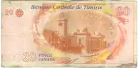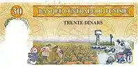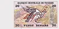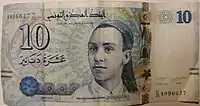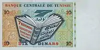 On 3 November 1958, banknotes were introduced by the Central Bank of Tunisia in denominations of 12, 1 and 5 dinars.[4] The designs of these denominations were changed with a series of notes dated 1-6-1965, but issued on 3 March 1966. A 10-dinar note dated 1-6-1969 was issued on 2 January 1970. The last 12-dinar notes were dated 1973-10-15 whilst the last 1-dinar notes were dated 1980-10-15. 20-dinar notes dated 1980-10-15 were introduced on 26 December 1984. 30-dinar notes were issued between 1997 and 2011. 50-dinar notes dated 2008 were issued on 25 July 2009.[5] On 8 November 2005, an updated version of the frequently used 10-dinar note was issued.