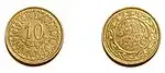 It was on 26 December 2013 that the two new tridecagonal coins were introduced, 200 millimes (copper-zinc, 29 mm diameter, 1.80 mm thickness, 9.4 gr. weight) and 2 dinar (copper-nickel, 29.4 mm diameter, 1.90 mm thickness, 11.2 gr. weight).[3]