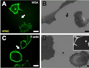 - ↑ Wang ZG, Liu SL, Tian ZQ, Zhang ZL, Tang HW, Pang DW (November 2012). "Myosin-driven intercellular transportation of wheat germ agglutinin mediated by membrane nanotubes between human lung cancer cells". ACS Nano. 6 (11): 10033–10041. doi:10.1021/nn303729r. PMID 23102457.