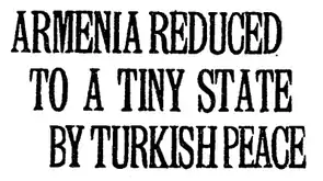 The Turks, headquartered in Alexandropol, presented the Armenians with an ultimatum which they eventually accepted. They followed it with a more radical demand which threatened the existence of Armenia as a viable entity. The Armenians at first rejected this demand, but when Karabekir's forces continued to advance, they had little choice but to capitulate.[40] On November 18, 1920, they concluded a cease-fire agreement.[1] During the invasion, mass atrocities against Armenian civilians in Kars and Alexandropol were alleged, including rape and massacre of civilians.[12][13][14]