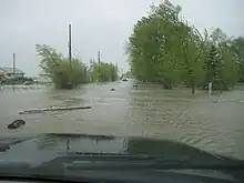 Twin Lakes Beach has been the recipient of many storms causing shoreline erosion, flooding and property damage. Most notably are the storms of the fall of 1999, especially the storm on November 1 , as well as the fall of 2010 "weather bomb" both of which involved wind gusts of over 100 km/h and high winds for an extended period of time with the result being a shift in the lake of water from the north basin of Lake Manitoba to the south basin of the lake and large waves. Both storms resulted in considerable shoreline erosion, property damage, and some flooding. The 1999 storm caused an estimated $1 million in damage and was a catalyst for establishing new regulation of lake levels.[5] Also in 1981 and 1992 cottages were destroyed as a result of shoreline ice pile-up. On July 29, 2012 a thunderstorm occurred at Twin Lakes Beach causing widespread damage to property including complete destruction of homes due to heavy rain, hail, and plow winds with gusts up to 150 km/h recorded on radar.[16][17]