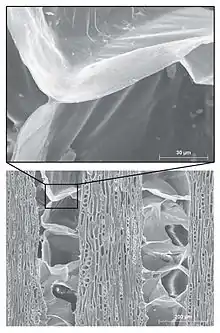 In woody plants, a tylosis (plural: tyloses) is a bladder-like distension of a parenchyma cell into the lumen of adjacent vessels. The term tylosis summarises the physiological process and the resulting occlusion in the xylem of woody plants as response to injury or as protection from decay in heartwood.[1] It is a key process in wall one of the compartmentalization of decay in trees (CODIT) and other woody plants.
