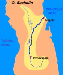 The Tym (Russian: Тымь) is a river on the island of Sakhalin, Russia, and the second longest river on the island after the Poronay. It is 330 kilometres (210 mi) long, and has a drainage basin of 7,850 square kilometres (3,030 sq mi).[2] The name of the river is translated from Nivkh as "spawning river." The river flows through Tymovsky and Nogliki Districts of Sakhalin Oblast. It begins on the southern slopes of Mount Lopatin in the East Sakhalin Mountains, flows through swampy lowlands in the Tym-Poronaiskaya Valley, and finally flows into Nyisky Bay in the Sea of Okhotsk. The villages of Tymovskoye and Nogliki are located beside the river.