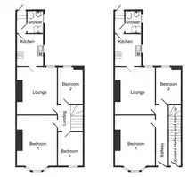 Representative floorplans for a pair of flats, upper floor on the left, ground floor on the right. Modern bathroom conversions to the rear.