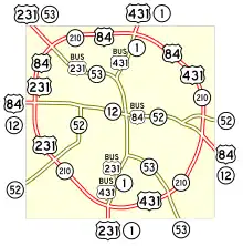 U.S. 431 is paired with unsigned State Route 1 throughout almost all of Alabama, with the exception of Dothan, where it is paired with signed State Route 210 around the eastern portion of the bypass named Ross Clark Circle. There is also a business route through downtown Dothan signed as Business US 431 and locally known as Reeves Street which runs into Business US 231. The two routes are signed concurrently through downtown and known locally as N. Oates Street north of Main Street (Business US 84) and S. Oates Street south of Main Street. The southern terminus of US 431 is at the intersection of US 231 and the business spurs on the south side of Ross Clark Circle. Along with US 84 and US 231, all three routes form the Ross Clark Circle, which is also a beltway around Dothan while their business routes go through the city, though the beltway is not officially designated as such.
