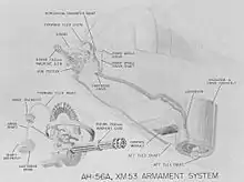 The M3, sometimes referred to as "Aerial Rocket Artillery" (ARA), consisted of two 2.75" 24-Tube rocket launchers, one on either side of the aircraft, along with a Mk 8 sight. The launchers fired in pairs, one from each side to prevent the aircraft from becoming off balance. M3 systems were attached to the helicopter using Bell designed stores racks.[2][3] The only difference between the XM3 and XM3E1 was that the launch tubes on the E1 were 4" longer. The XM3E1 was standardized as the M3.[3]