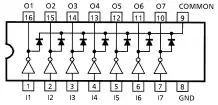 The ULN2003A is an integrated circuit produced by Texas Instruments. It consists of an array of seven NPN Darlington transistors capable of 500 mA, 50 V output. It features common-cathode flyback diodes for switching inductive loads (such as servomotors). It can come in PDIP, SOIC, SOP or TSSOP packaging.[1][2] In the same family are ULN2002A, ULN2004A, as well as ULQ2003A and ULQ2004A, designed for different logic input levels.