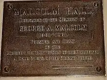 George A. Malcolm is commemorated in a plaque that graces the front entrance of the college.