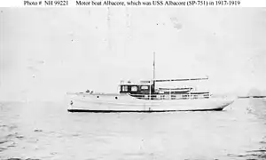 Albacore was built as a civilian motorboat of the same name in 1900 by Howard Brothers at San Diego, California. The U.S. Navy acquired her from her owner, Bryant H. Howard of San Diego, in 1917 for World War I service as a patrol vessel. Ordered to be delivered to the Navy on 21 June 1917, she was commissioned soon thereafter as USS Albacore (SP-751).