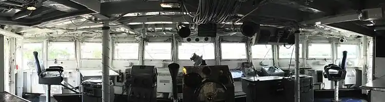 For all these reasons, the U.S. Navy decided to close DS Barry and tow her away for scrapping before construction of the new bridge advanced to the point of trapping her in the Anacostia River.[4] During the summer of 2015, representatives of the U.S. Navy's Naval History and Heritage Command, followed by representatives of approved non-profit museum ships, visited Barry and removed artifacts from her for display elsewhere, with communications gear being the most popular items.[10] A formal departure ceremony for the ship hosted by Naval Support Activity Washington, attended by more than 50 former Barry crew members and featuring a speech by retired Rear Admiral Sam Cox, director of the Naval History and Heritage Command, took place on 17 October 2015 in the Cold War gallery at the Washington Navy Yard.[1][10]