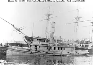 ![]() USS Charles Mann (SP-522) at the Boston Navy Yard in Boston, Massachusetts, sometime between 1917 and 1919. | |