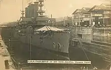 Placed in commission in reserve on 14 September 1912, Charleston joined the Pacific Reserve Fleet, remaining at Puget Sound as a receiving ship through early 1916, aside from a voyage to San Francisco in October 1913 as flagship for the Commander-in-Chief, Pacific Reserve Fleet. From 1912 through early 1916, she was receiving ship at the yard. With a new assignment as tender for the submarines based in the Panama Canal Zone, Charleston arrived at Cristobal, C.Z. on 7 May 1916, for a year of operations with submarines, reconnaissance of anchorages, and gunnery exercises.[4]