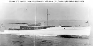 Cossack was built as a civilian motorboat of the same name in 1916 by George Lawley & Son of Neponset, Massachusetts. Upon the entry of the United States into World War I, the U.S. Navy acquired her in April 1917 for war service as a patrol boat. She was commissioned as USS Cossack (SP-695) at Boston on 1 May 1917.