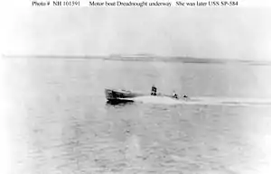 Dreadnought was built as a private fast "runabout" motorboat of the same name by R. Bigelow at Monument Beach, Massachusetts, in either 1916 or 1917. On 17 May 1917, the U.S. Navy acquired her from her owner, Eldon B. Keith of Brockton, Massachusetts, for use as a section patrol boat during World War I. She was commissioned as USS Dreadnought (SP-584) on 20 October 1917.