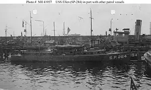 - ↑ Although another patrol vessel of the same name, USS Ellen (SP-1209), was in commission at the same time, the differing information available at NavSource Online (at http://www.navsource.org/archives/12/170284.htm) and the Naval History and Heritage Command Online Library of Selected Images (at http://www.history.navy.mil/photos/sh-usn/usnsh-e/sp284.htm) does not suggest that confusion between SP-284 and SP-1209 explains the confusion over SP-284's history and characteristics. It may be that a third, unreported USS Ellen existed at the time and has been confused with SP-284.