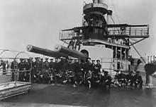 Iowa was armed with a main battery of four 12 in (305 mm)/35 caliber guns mounted in two twin-gun turrets that were mounted on the centerline, one forward and the other aft of the superstructure.[7] The built-up guns were the Mark II type, which were placed in elliptical Mark III turrets. The training gear was hydraulically operated, but elevation was hand-operated only. The gun mounts allowed elevation to 14 degrees and depression to −5 degrees; to reload the guns, they had to be returned to 3 degrees elevation. The ammunition hoists that retrieved shells and propellant charges from the magazines were also hydraulically operated. The guns fired an 850 lb (390 kg) shell with a 425 lb (193 kg) charge of brown powder. Muzzle velocity was 2,100 ft/s (640 m/s), and at the muzzle, the shells could penetrate up to 24 in (610 mm) of mild steel; at a range of 2,500 yd (2,300 m), their penetration capability fell to 19 in (483 mm). The average rate of fire was one shot every five minutes, though fresh, well-trained crews could achieve rates as fast as one shot every three minutes.[9]