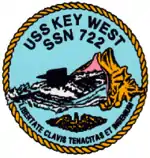 The submarine insignia symbolizes the heritage that the ship has with all past and future submarines. The motto "Liberate Clavis Tenacitas et Ingenium" translates to "The Key to Freedom is Tenacity and Resourcefulness". Specifically, the phrase "The Key to Freedom" represents the namesake city and the submarine's mission to protect the fundamental rights and liberties of the American people.[11] The phrase "Tenacity and Resourcefulness" was used by the Mayor of Key West during his speech at the ship's launching to describe the characteristics of a true Conch —a native of Key West. Additionally, "Ingenium" is a word used by the ancient Greek and Roman historians to describe the resourcefulness and ingenuity of sailors in the period.[12]