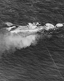 After she was thoroughly examined, Iowa and two other vessels used Nevada as a practice gunnery target 65 miles southwest of Pearl Harbor on July 31, 1948.[4][71][lower-alpha 11] The ships did not sink Nevada, so she was given a coup de grâce with an aerial torpedo hit amidships.[89][4]