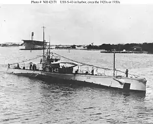 ![]() USS S-43 at San Diego, California, with aircraft carrier USS Langley (CV-1) in the background, sometime between 1924 and 1936. | |
