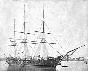Her first cruise took the frigate to Montevideo and Buenos Aires in October 1858 with the Paraguay expedition, a task force commanded by Flag Officer William B. Shubrick, after that country's firing on USS Water Witch. She conveyed Commissioner Bowlin and served as flagship during the voyage to South America, but was not officially considered part of the expedition fleet, as she was not designed to act against Paraguay, not being able to ascend the river.[1] The expedition won the United States an indemnity, an apology, and a renewed treaty. Sabine then operated out of New York with the Home Fleet until July 1861.