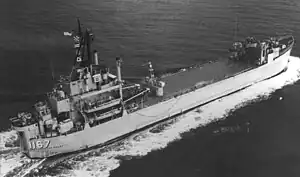 From 7 September through 1 October 1972 Westchester County operated in logistic support of Mine Flotilla 1. She returned to Yokosuka on 15 October for availability and inspection. The ship made a brief transit to Okinawa, departing on 30 November. She returned to Yokosuka on 5 December 1972 and enjoyed the Christmas holidays while in upkeep status. On 27 January 1973, following the signing of the Paris Peace Accords, the ship was underway for Subic Bay to transport mine counter-measures equipment and Commander, Mine Flotilla One to the Gulf of Tonkin. Due to a breakdown in the cease-fire negotiations, the tank landing ship was ordered to a rendezvous point near Da Nang. Departing the vicinity on 3 March, she continued to work in support of "Operation End Sweep". After availability and shore bombardment exercises at Subic Bay which commenced on 14 March, Westchester County returned to Vietnam in support of "Operation End Sweep" which was completed on 18 July. The ship made stops at Subic Bay and Okinawa before finally arriving at Yokosuka on 30 July. Westchester County was decommissioned on 30 August 1973 and arrived at the Inactive Ship Facility, Puget Sound Naval Shipyard, Bremerton, Washington on 30 November of that year. On 27 August 1974 she was turned over to the Turkish Navy and commissioned as Serdar (L-402). Decommissioned by the Turkish Navy in 2011 and sunk as a target on 30 May 2014.[2]