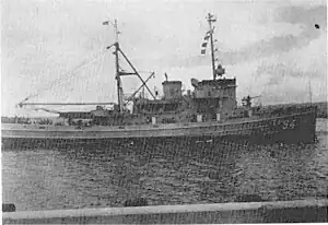 That move, however, did not presage her early participation in the war which had broken out in Korea just two weeks earlier for, after visits to Sasebo in Japan and to Subic Bay in the Philippines, she returned to Guam on 2 August 1950 and resumed duty in the Pacific Trust Territories for another year. During that 12-month period, she visited Japanese ports and, no doubt, performed missions in distant support for the United Nations forces fighting in Korea. She also made several voyages to Pearl Harbor and operated at various islands—notably Kwajalein, Eniwetok, and Guam in the Trust Territories. In September 1951, she returned to Japan, arriving at Sasebo on 17 September 1951. With that arrival, Yuma began her seven months of duty in the combat zone. She made numerous voyages between Japanese ports and Wonsan, Korea, in support of the troops and ships fighting in and around Korea.[1] On 10 October 1951, with USS Reclaimer, she towed the British Royal Navy hospital ship RFA Maine which had lost a propeller, on a westward passage through the crowded and narrow Shimonoseki Straits. This was the only hospital ship supporting UN Forces at that time.[2]