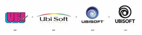 The evolution of the Ubisoft logo. The initial logo was created on the company's founding in 1986. With the publication of Rayman, the company used the rainbow shape to show their shift from distributor to a publisher in 1995. The blue "swirl" was introduced in 2003 with the rebranding from "Ubi Soft" to "Ubisoft", alongside their acquisition of the Tom Clancy licence. Another swirl was introduced in 2017, designed to appear as windows into their game worlds while retaining a grain de folie (touch of madness). This excludes the two logos following the 1986 logo and before the 1995 logo.[25]