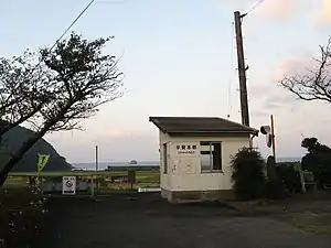 The station is hidden among the surrounding houses, making it difficult to see from a distance. The sea is close across the field, and the scenery from the train window is good because it passes along the coast from the neighboring Nagato Futami Station to Kogushi Station.