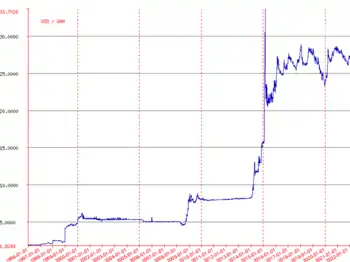 As from 7 February 2014, following political instability in Ukraine, the National Bank of Ukraine changed the hryvnia into a fluctuating/floating currency in an attempt to meet IMF requirements and to try to enforce a stable price for the currency in the Forex market.[26] In 2014 and 2015 the hryvnia lost about 70% of its value against the U.S. dollar, with the currency reaching a record low of ₴33 per dollar in February 2015.[27]