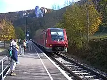 Shorter trip times, as well as the move of the single-track train crossing points between Tuttlingen and Sigmaringen, would also be the pre-requisites for the development of a Stadtbahn Tuttlingen, which has been under discussion since 2006. This model would use the Donautalbahn, which runs through the city center, as well as residential and industrial areas in the Tuttlingen area, as a city rail line (Stadtbahn), and would connect the communities east of Tuttlingen, which are poorly served by the Ringzug, to this network.[7] Probably the most ambitious plans are the ones for a S-Bahn network Ulm/Neu-Ulm. These plans, extant since the 1990s, envision the construction of a new rail line, which would branch off the existing Donautalbahn in Ehingen (Donau) and go to Erbach (Donau) on the Südbahn. This new railway would see only the RegionalExpress trains going from Ulm via Sigmaringen to Neustadt (Schwarzwald), which would significantly cut the trip times. The old section between Ehingen via Blaubeuren, which is densely populated, would be served by a new S-Bahn in the Ulm area. The new section has been tagged with a cost of 75 million Euros. The regional association Donau-Iller supports these plans, which are opposed by the government of the state of Baden-Württemberg.[8][9]