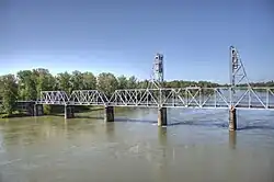 The bridge's draw span being raised. The lift mechanism has been inoperable since 1980, and the operator's house (which also housed the motors powering the lift) has been removed.[3]