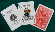 Current standard Bicycle cards: the ace of spades, joker, and the Rider Back in red