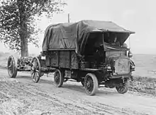 Before the American entry into the war, many American-made heavy four-wheel drive trucks, notably made by Four Wheel Drive (FWD) Auto Company, and Jeffery / Nash Quads, were already serving in foreign militaries, bought by Great Britain, France and Russia. When the war started, motor vehicles had begun to replace horses and pulled wagons, but on the European muddy roads and battlefields, two-wheel drive trucks got stuck all the time, and the leading allied countries could not produce 4WD trucks in the numbers they needed.[62] The U.S. Army wanted to replace four-mule teams used for hauling standard 11⁄2 U.S. ton (3000 lb / 1.36 metric ton) loads with trucks, and requested proposals from companies in late 1912.[63] This led the Thomas B. Jeffery Company to develop a competent four-wheel drive, 11⁄2 short ton capacity truck by July 1913: the "Quad".