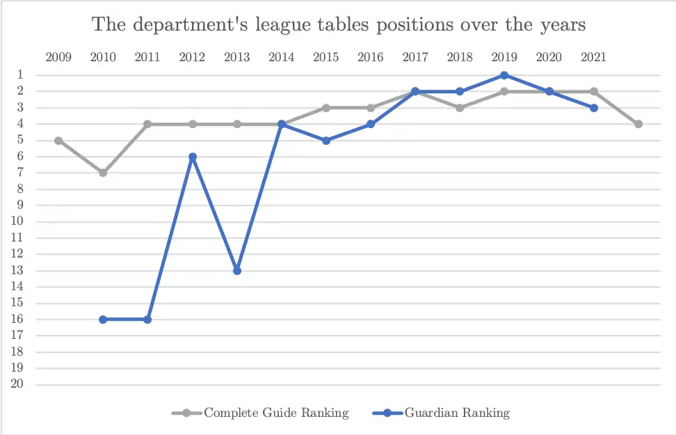 In 2017, the department's BSc/MSci programme was ranked 1st in the Guardian's university guide,[3][4] 2nd in The Complete University Guide[5] and 3rd in The Times & Sunday Times Good University Guide 2017.[6]